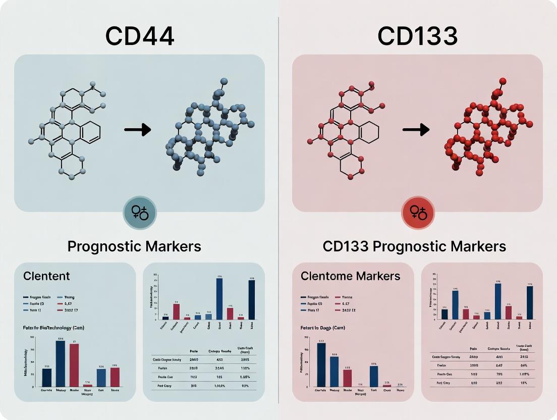 The comparative analysis reveals that neither CD44 nor CD133 is a universally superior prognostic marker; their utility is highly context-dependent on cancer type, isoform detected, and methodological rigor. CD44, with its variant isoforms, often shows strong association with invasion and metastasis, while CD133 remains a key marker for primitive stem-like populations but is confounded by epitope detection issues. The future lies in moving beyond single-marker paradigms. Integrating both markers into multiplexed assays, standardizing detection protocols, and correlating their expression with functional stemness assays and omics data will be crucial. For drug development, this implies targeting complementary CSC subsets and using these markers for robust patient stratification in clinical trials, ultimately paving the way for more effective anti-CSC therapies and improved prognostic models.